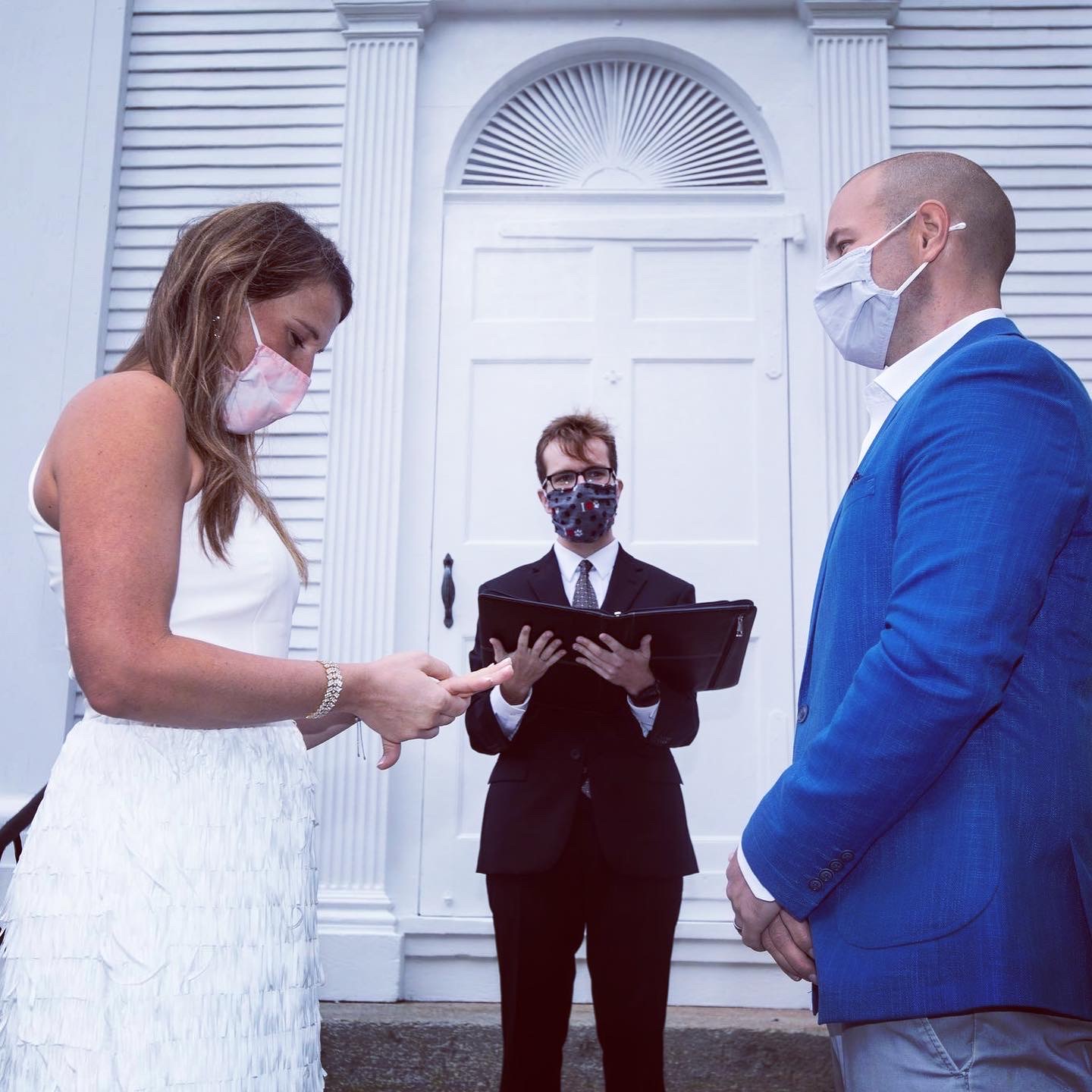 “Alex did a wonderful job officiating our wedding and solemnizing our marriage on the steps of the First Parish in Wayland. Despite multiple changes in the ceremony’s date and logistics (due to a global pandemic!) Alex remained professional and flexible throughout, really putting us at ease during a difficult yet exciting time. The words that Alex prepared for our ceremony were perfect for us and our story, and we are so grateful that he was part of our special day.”